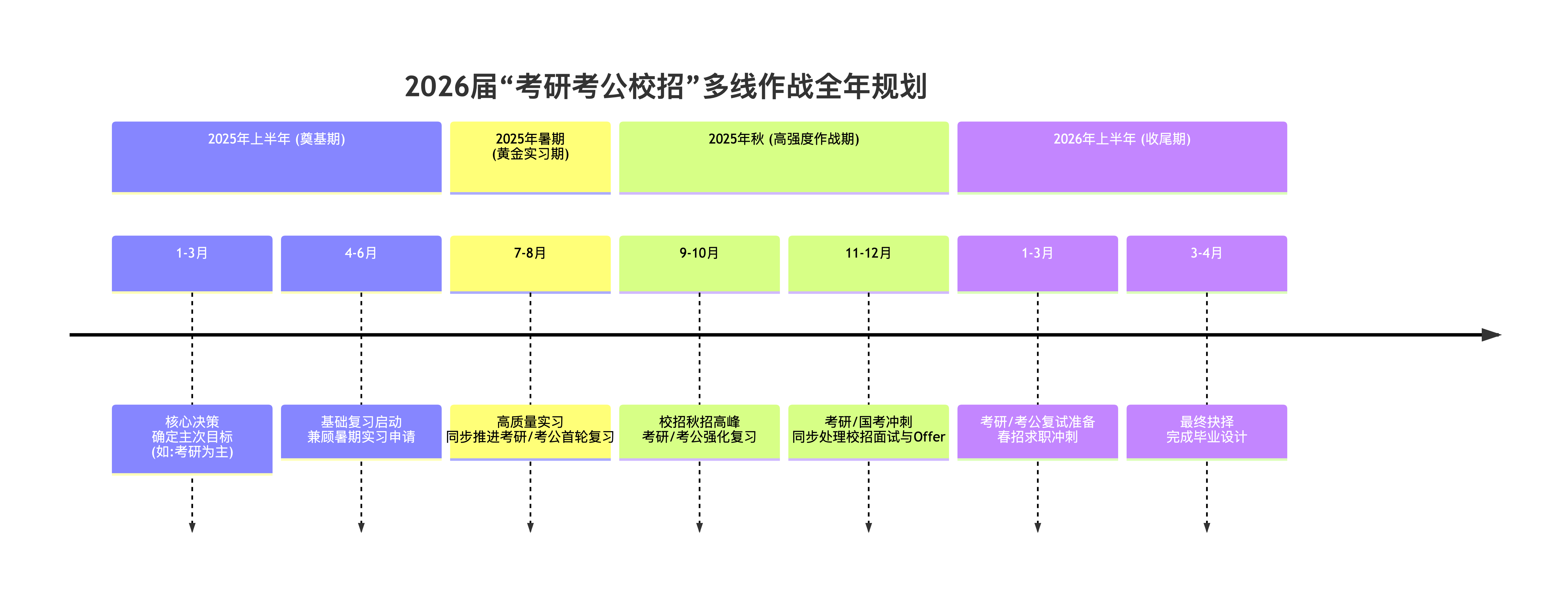 为2026届学生同时准备考研、考公和校招,是一次极高强度的“多线作战”。成功的核心不是平均用力,而是战略性取舍与精准化执行。下图直观地展示了全年关键任务与时间管理心法,帮助你建立宏观认知: