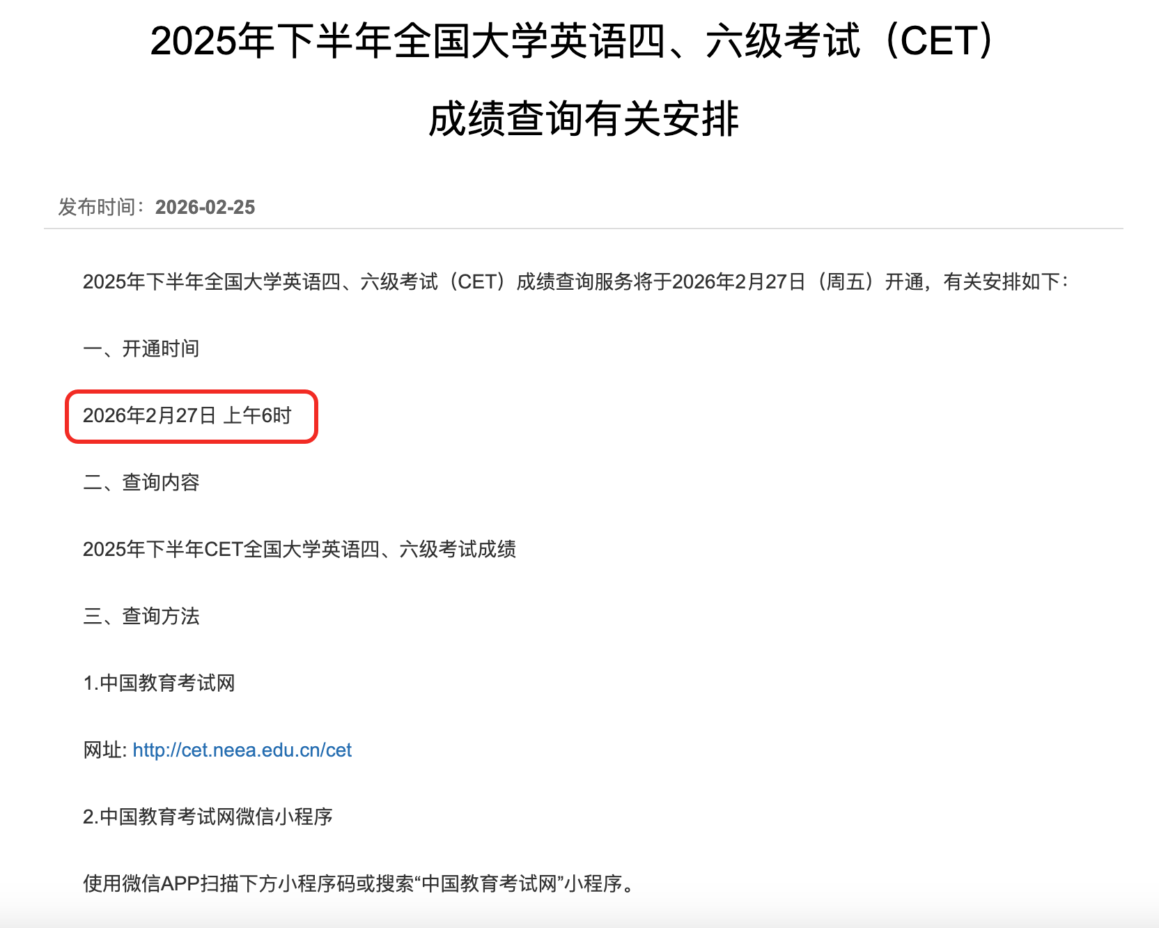 四六级教育考试网发布消息!2026年上半年,全国大学生英语四、六级考试成绩查询服务,将于2026年2月27日(周五)上午6时开通,有关安排如下: