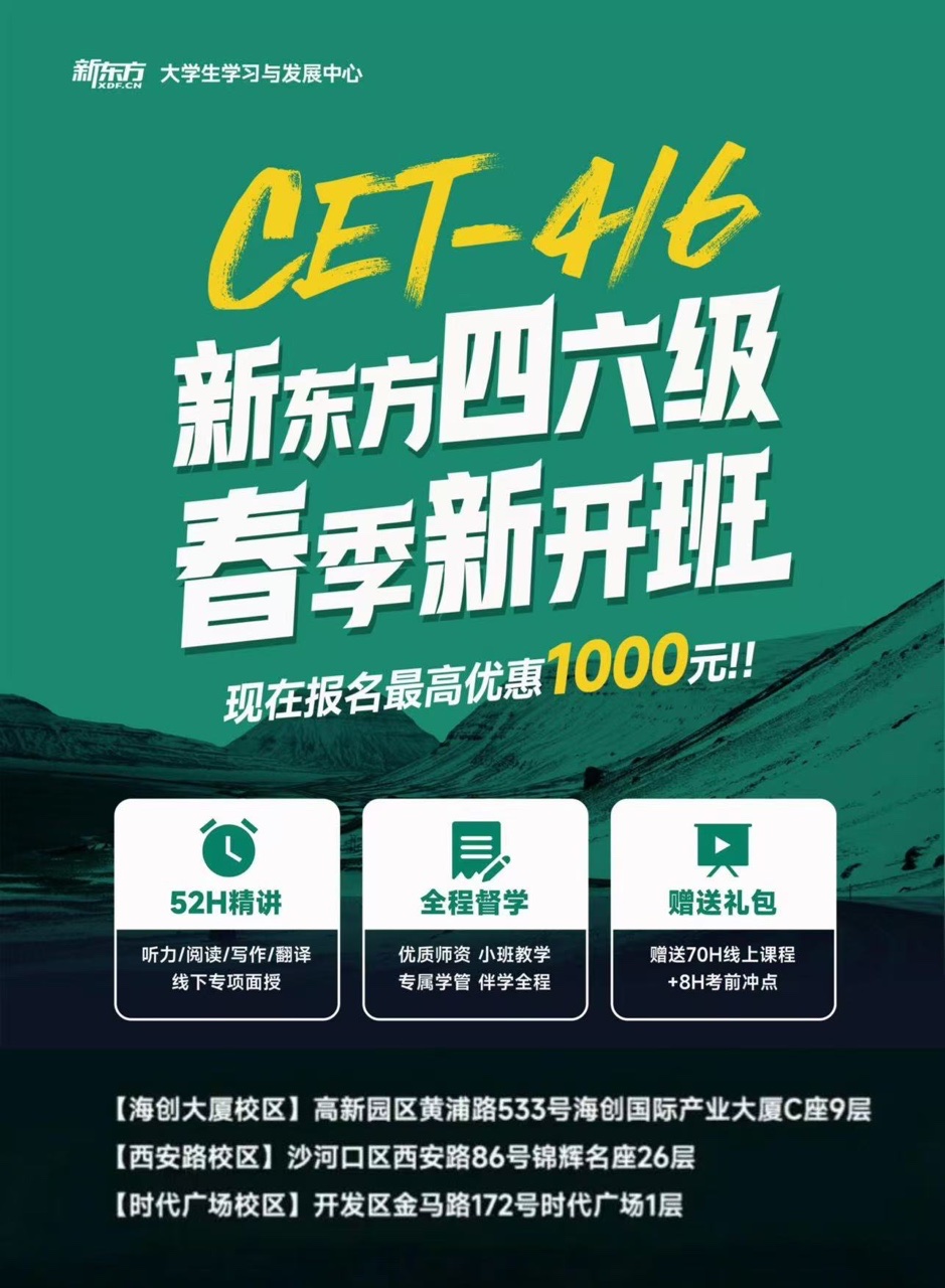 大连新东方精心打造四六级无忧课程,兼顾学习兴趣培养与应试能力提升,专业线下面授全程护航,助你高效攻克四六级难关。寒假班、春季班、VIP 一对一,班型丰富齐全,火热招生中。